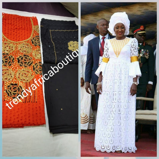 African lace fabric in 3yrds. Embellished with Beads and stoned neckline + 2yds wrapper + 1.5yds headwrap 6.5yds total as a set. Quality stone work for kaftan dress. Black/Red color combination