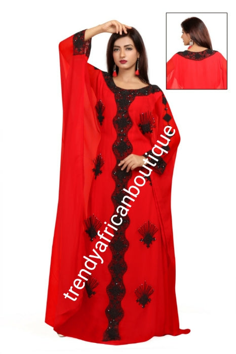 Dubai kaftan free flowing dress. 2 piece set Red/black beaded and stoned. Available in L and XXL. Beaded and stones chiffon kaftan for evening dress
