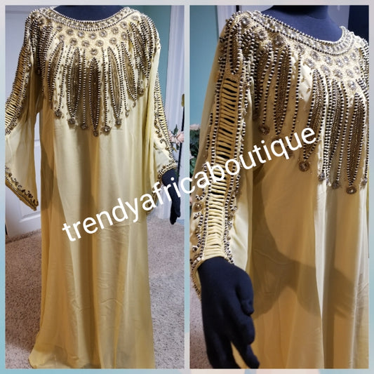 Champagne gold free flowing Dubai Kaftan bubu. Beaded and stones. Quality bead work. Free size. Chiffon kaftan dress
