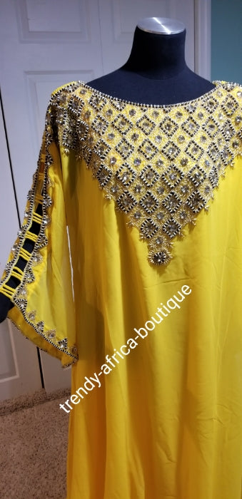 Yellow Long free flowing kaftan dress. Beaded/stoned. Dubai kaftan Bubu for special occasion. Free size fit up to Size 1 XL. Made with chiffon material