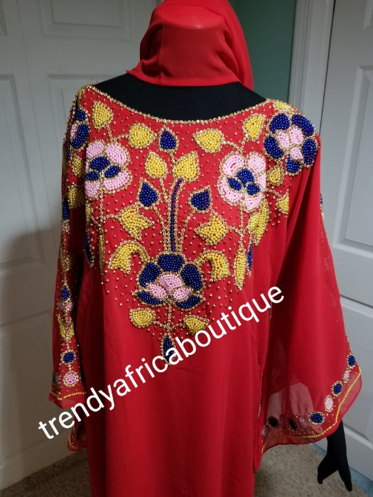 Special price offer, Red dubai kaftan free flowing boubou. Multi color Beaded and stonesd to perfection. Quality bead work. Availablein size, S,M,L,XL and XXL.. Chiffon kaftan With head tie. 60' long