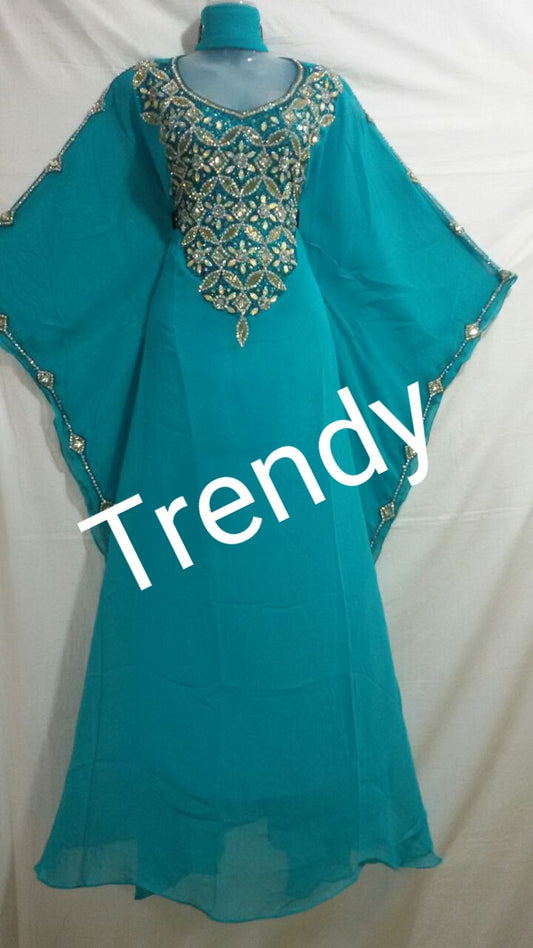 Turqouse blue African Bubu kaftan dress. Full chest Dazzling Crystal Stones and sleeve line. Free flowing rob.