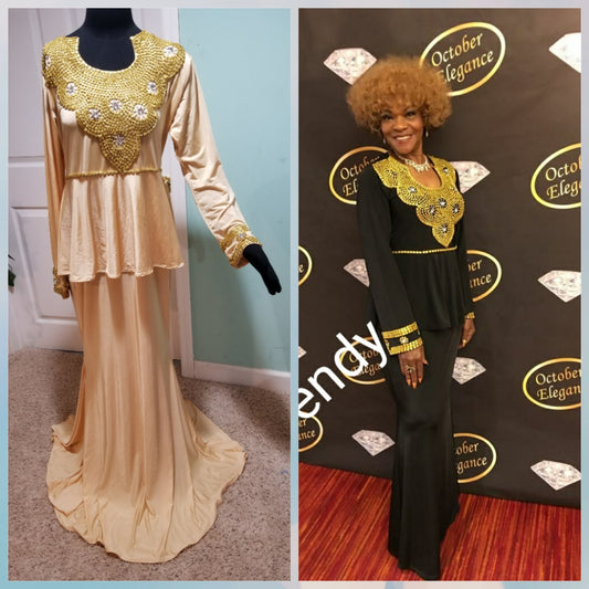 • Indian Kaftan dress made with Lycra/spandex fabric. Long free flowing dress champagne gold color wit Gold beads.
