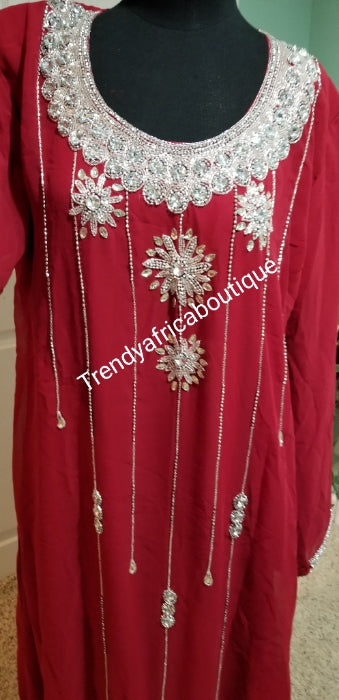 • Free flowing Dubai kaftan dress in Red. Bubu dress free size fit up to 1XL. Beaded and stones chiffon kaftan for evening dress
