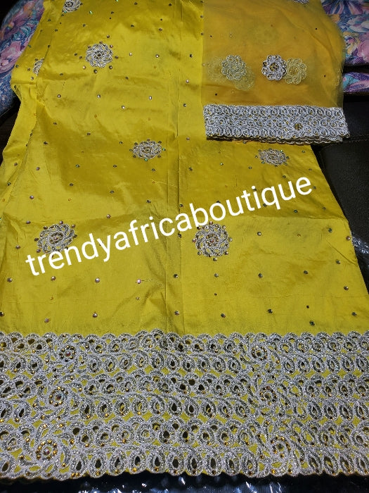 New arrival: Sweet yellow quality taffeta embriodery and clear crystal stones silk George wrapper + matching net for making blouse combination. Nigerian traditional wedding Quality Indian-George. 5yds wrapper + 1.8yds net.Aso-ebi discount available)