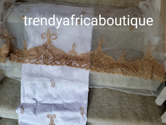 • Original quality White/gold embriodery and beaded silk George wrapper. Nigerian traditional wedding George, Quality Indian-George. 5yds wrapper + 1.8yds net matching blouse. Aso-ebi discount available