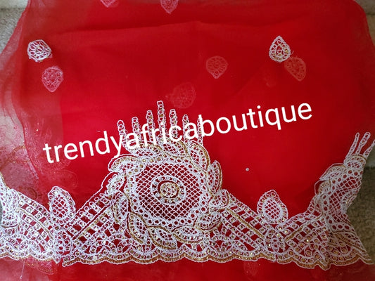 • Original quality Red embriodery and stoned taffeta silk George wrapper + red net for blouse combination. Nigerian traditional weddingQuality Indian-George. 5yds wrapper + 1.8yds net.Aso-ebi discount available