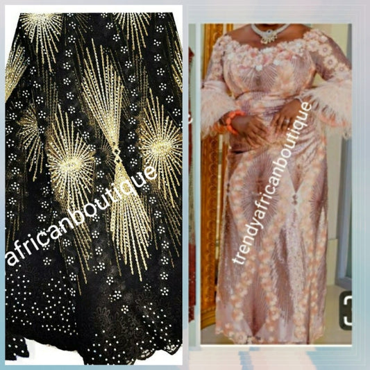 New arrival Black/Champagne gold African French lace fabric embellished with dazzling crystal stoned Net french lace. Sold per 5yds length. Aso-ebi order available per request in your color is choice.
