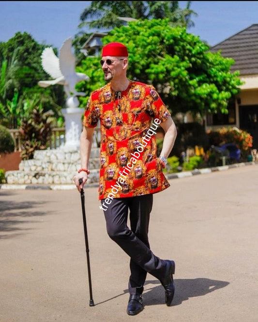 New arrival Isi-agu Igbo traditional/ceremonial shirt for men. Red/gold isi-agu shirt size 3XL Chest 50 inches, lenght 35""