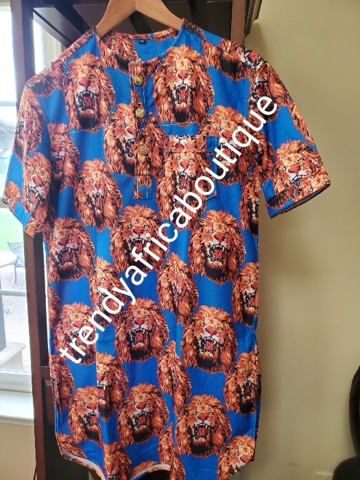 New arrival Isi-agu Igbo traditional/ceremonial shirt for men. Royal blue/gold isi-agu shirt size 4XL, Chest 52" and 35" long"
