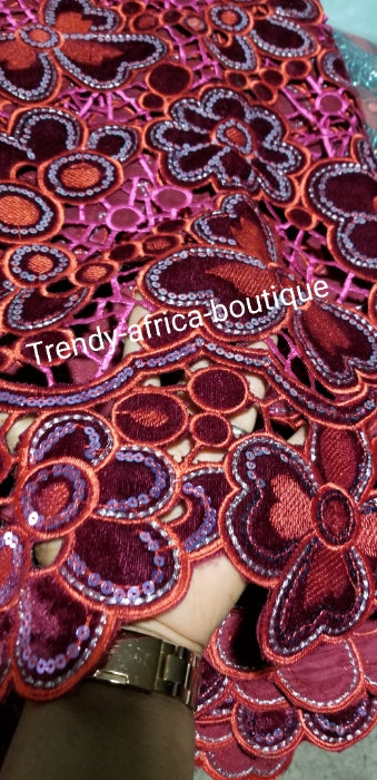 • Sale sale: Quality handcut Lace Velvet Wrapper. Wow factor design velvet fabric for that special occasion. Sold per 5yds. Available in wine or orange color.