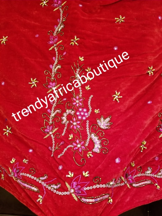 • New Arrival Red  Original velvet fabric beaded and stoned. Use for Nigerian Bridal wrapper/traditional weddings ceremony. Igbo/Edo Bride wrapper in velvet. sold per 2.5yds, pricenis for 2.5yds