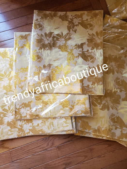 • Gold Latest Ajoke Sago Gele 2 in 1 pack. Lazer cut edges, stylish & elegancy sold per pack for head and shoulder piece.