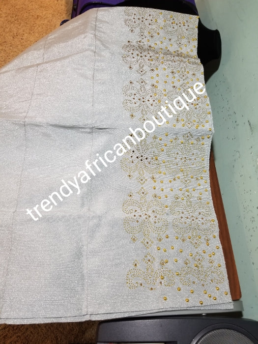 Pretty Silver Bedazzled aso-oke. Nigerian woven traditional Aso-oke for making beautiful head wrap. Beaded and Swarovski stones work for perfect headwrap finish. Gele only. Extra wide gele for bigger head wrap. 72" long × 26" wide
