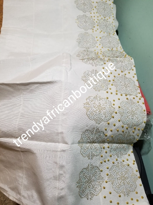 Classic White Bedazzled aso-oke, Nigerian woven traditional Aso-oke for making beautiful head wrap. Beaded + Gold Swarovski stones work for perfect headwrap finish. Gele only. Extra wide gele for bigger head wrap. 72" long × 26" wide