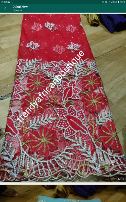 • Bonus sale: New arrival of Pepper Red VIP Net enbriodery + hand stoned George Wrapper. Dazzling crystal stones in Full 5yds + 2yards matching net + bonus 4yds Red Lining. Quality net. Do not miss this offer!! .purchase with  red Aso-oke gele is optional