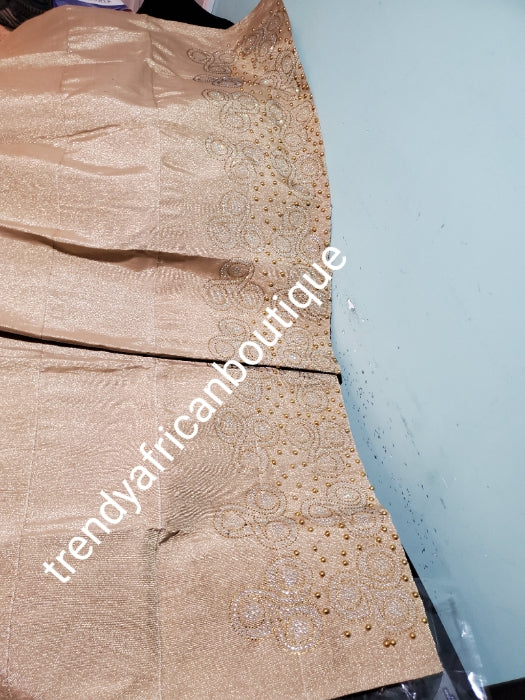 Champagne Gold crystal stoned and beaded Aso-oke Gele headtie. 4 wide for making bigger gele. classic Latest design of Nigerian Traditional aso-oke. Original aso-oke + Stone work. Great texture and easy to make into stylish gele