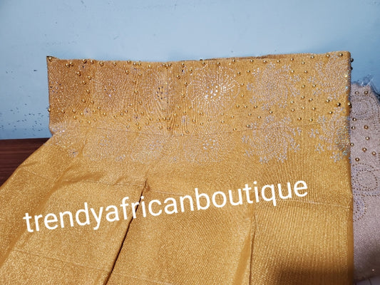 • New arrival classic metallic Gold Bedazzled Aso-oke Gele headtie. 26 inch wide for making  bigger gele. classic Latest design of Nigerian Traditional aso-oke. Original aso-oke + Stone work. Great texture and easy to make into stylish gele