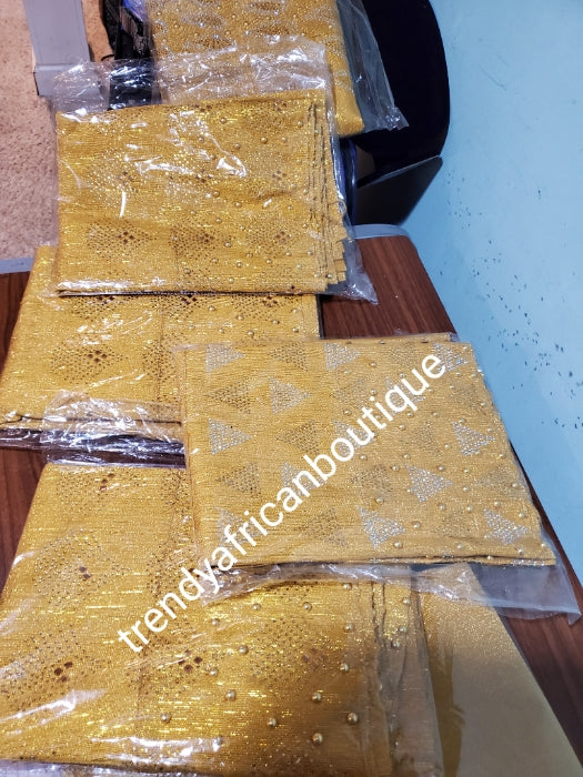 New arrival classic metallic Gold Bedazzled Aso-oke Gele headtie. 26 inch wide for making bigger gele. classic Latest design of Nigerian Traditional aso-oke. Original aso-oke + Stone work. Great texture and easy to make into stylish gele
