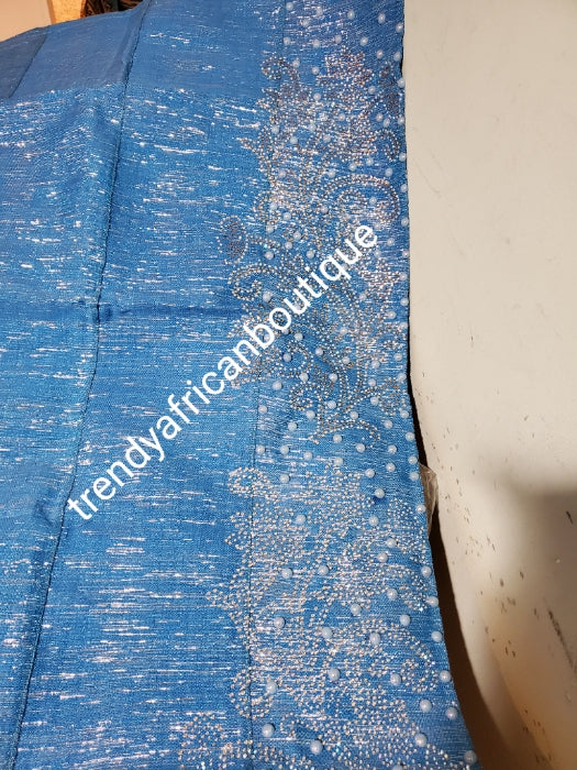 Quality turquoise blue Bedazzled aso-oke. Nigerian woven traditional Aso-oke for making stylish head wrap. Beaded and Swarovski stones work for perfect headwrap finish. Gele only. Extra wide gele for bigger head wrap. 72" long × 26" wide
