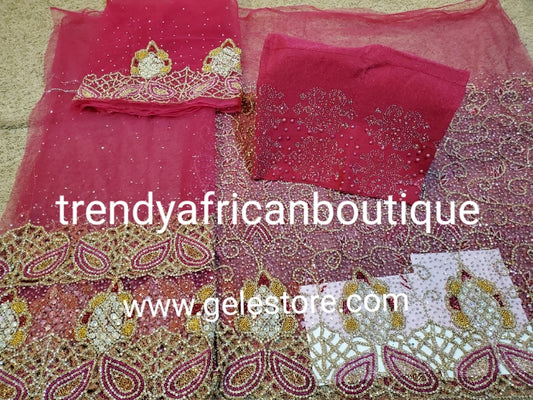 • Bonus sale: Exclusive fully loaded Super quality Hot pink  VIP Madam Net George wrapper for Nigerian bridal/Celebrant outfit.  all over hand beaded + crystal stones 2.5yds+ 2.5yds + 1.8yds + bedazzled aso-oke gele. Sold as a set.