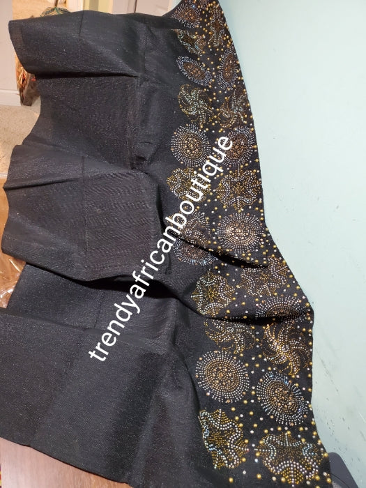 Pure Black Bedazzled aso-oke. Nigerian woven traditional Aso-oke for making beautiful head wrap. Beaded and Swarovski stones work for perfect headwrap finish. Gele only. Extra wide gele for bigger head wrap. 72" long × 26" wide