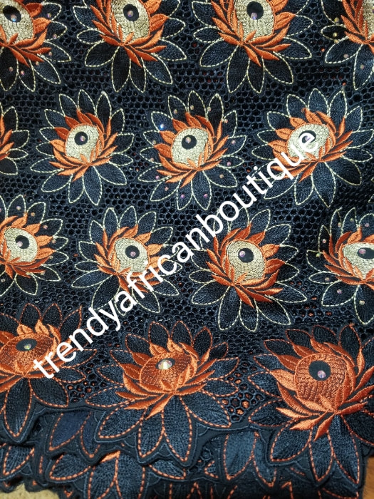 Sold with matching Gele. Exclusive swiss lace fabric Black/burnt Orange/beige swiss lace for African/ Nigerian outfit. soft beautiful design. Sold per 5yds + free gele