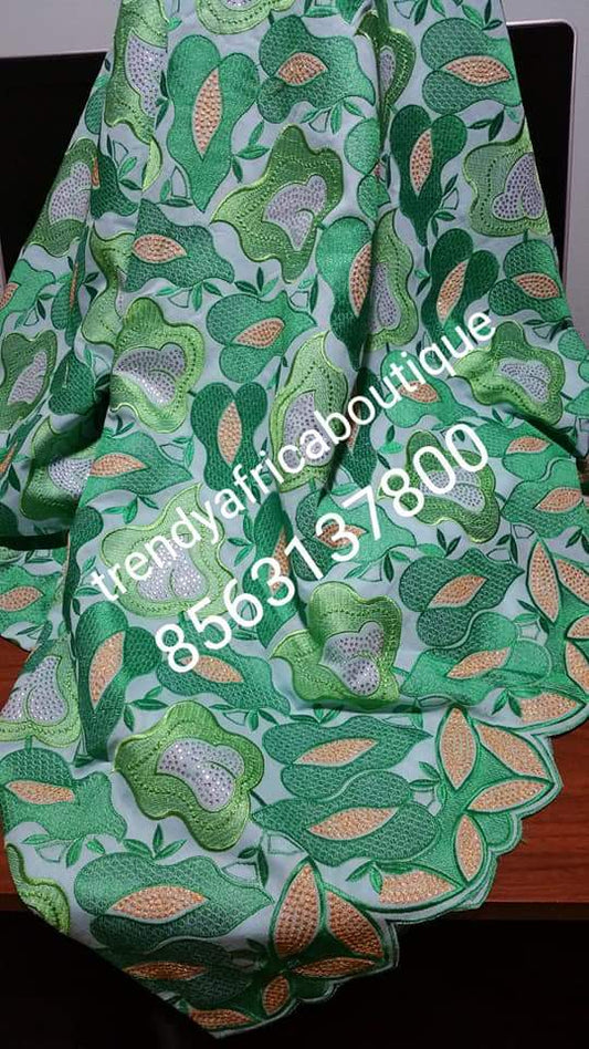 African Embroidery taffeta Silk George wrapper with matching blouse. Lemon green color. Small-George
