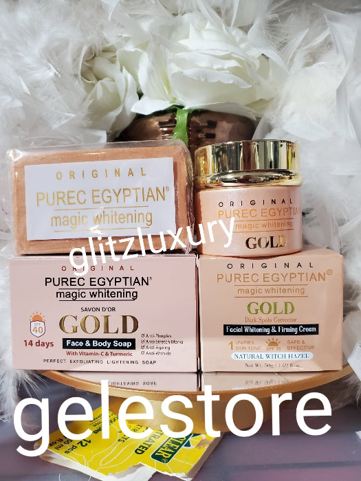 • 2pcs set:  ORIGINAL purec Egyptian magic whitening Gold dark spots corrector face cream.& the soap. Formulated woth vit. C and turmeric, natural witch hazel. spf 35. 👌