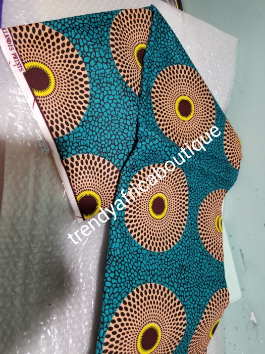 • peach /green Holland Veritable African wax print fabric. 100%  brocade cotton Ankara print for making African party outfit for men and women. Sold per 6yds and price is for 6yds. Soft luxurious Quality fabric