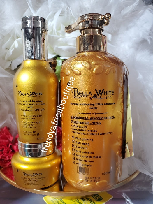 • Die Bella White Gold-Flasche ist eine stark aufhellende Ultra-Strahlung mit Glutathion, Glykolextrakten und Niacinamid-Körperlotion LSF 50