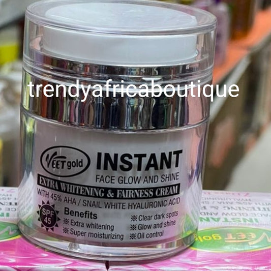 • Veet Gold Instant Face Glow und Shine Extra Whitening & Fairness Gesichtscreme. 50gx1 Glas. 45 % AHA, Schneckenschleim + Hyaluronsäure. Lichtschutzfaktor 45.