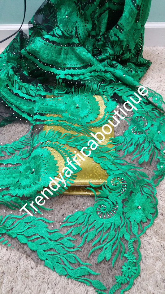 Afrikanischer Netzstoff aus französischer Spitze mit durchgehenden Steinen. Grüne Farbe. Verkauft 5 Yards. Das abgebildete Model trägt Lila