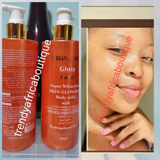 • 2 in 1 Arabische magische weiße Gluta-Karotte und arabisches weißes Vit. C-Öl. Super hautaufhellende und strahlende Körperlotion 350 ml. Formuliert mit Karottenextrakten und hautstrahlenden Inhaltsstoffen