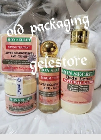 4-teiliges Set „Mon Secret“ mit schneller Wirkung, Eclaircissant, Kombination aus Aufhellung, Aufhellung und Glanz. Gegen schwarze Flecken und Markierungen. Körperlotion 300 ml, Serum 60 ml, Gesichtscreme 50 g + Gesichtsseife