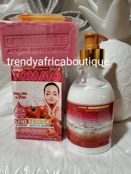 • Kombiniertes 3-in-1-Set Lab White Atom Whitening Körperlotion 250 ml + Peeling-Seife und Gesichtscreme mit Tomatenextrakt, Kojic und Glutathion-Kollagen-Extrakten.