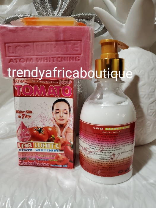 • Lab White Atom Whitening Körperlotion 250 ml + Gesichts- und Körperseife mit Tomatenextrakt, Kojic und Glutathion-Kollagen-Extrakten.