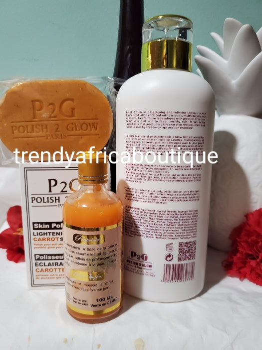 Aufhellungs-Kombi-Angebot: P2G (Polish to Glow) Pariser hautaufhellende und polierende Körperlotion mit Karottenextrakten + Kojic-Karotte Ultra Ecclaircissant + P2G-Peeling-Seife-Aufhellungs-Kombination