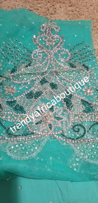 Neu eingetroffenes VIP/Celebrant Seiden-George-Deckblatt in Mintgrün. Alles von Hand gesteinigt. 5 Yards und 1,8 Yards passende Netzbluse für diesen besonderen Anlass. Traditionelle nigerianische Igbo-Hochzeitsverpackung