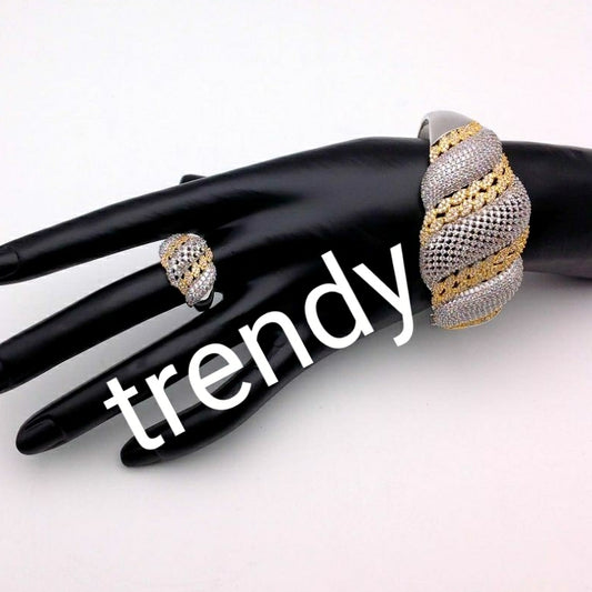 Set aus 22 Karat galvanisiertem Armreif und Ring. Dubai Handbesatz mit CZ-Steinen. Wunderschöner Armreif. Erhältlich in zwei Farbtönen und ganz in Silber. Der Ring hat eine Einheitsgröße