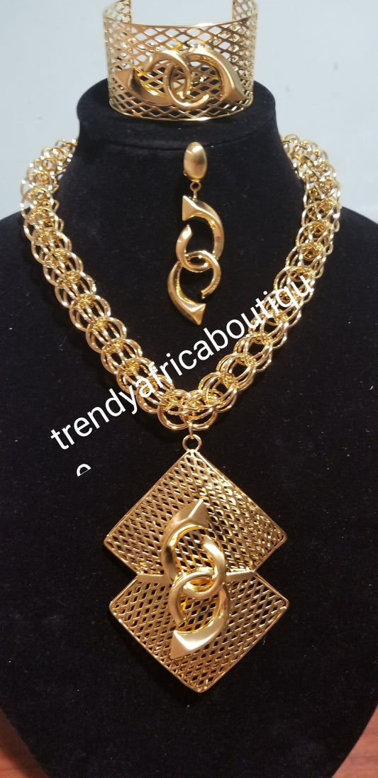 • 3-teiliges Set mit 18-Karat-vergoldetem Halskettenset mit großem Anhänger. Passender Armreif und Ohrhänger. Afrikanisches/nigerianisches Party-Halsketten-Set