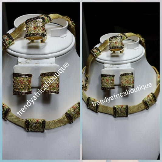 4Stk. 18 Karat vergoldetes Omega-Halskettenset. Im Lieferumfang sind passende Ohrringe, Armreif und Ring enthalten. Gold-/rotes Design für afrikanische Partys
