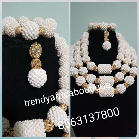Auffälliges und wunderschönes 3-Rollen-Koralle-Perlen-Halsketten-Set in Weiß. Verkauft mit Armband und Ohrringen. Verwendung für große afrikanische/nigerianische Zeremonien. weiße Farbe