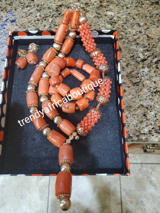 • Original Edo-Korallen-Perlen-Halskette, Set aus 3 Rollen traditioneller nigerianischer Korallenperlen. Celebrant/Red-Carpet-Korallenhalskette mit Armband und Ohrringen