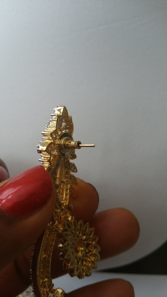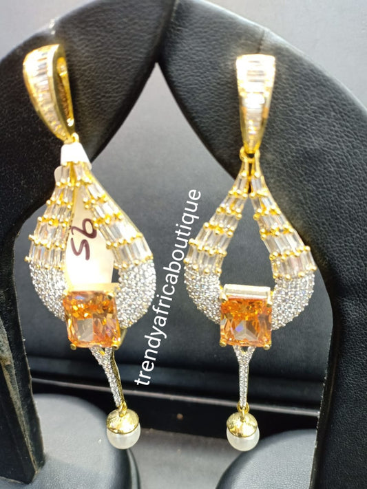 22 Karat galvanisierte America-Diamant-Ohrringe. Handbesetzt mit hochwertigen, schillernden goldenen CZ-Steinen. Originalqualität, hypoallergen. Leichte Ohrhänger. Wunderschöne Brautaccessoires