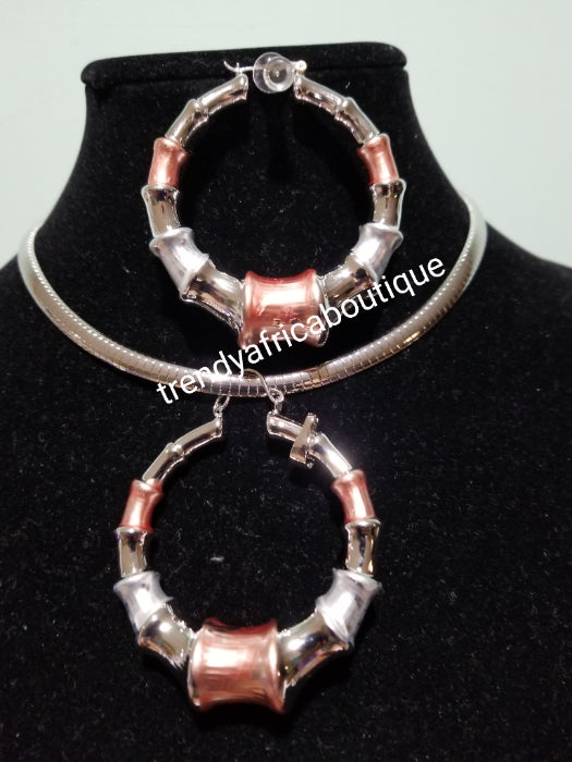 • Hochwertiger, versilberter zweifarbiger Anhänger/Ohrringe, besetzt mit einer silbernen Omega-Kette. 3-teiliges Set, Ohrringe/Anhänger/Omega-Kette