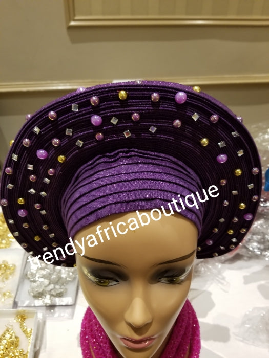 Lila Auto-Gele, hergestellt aus hochwertigem Aso-Oke. Hochwertige Handarbeit mit Perlen und Steinen. Einheitsgröße, einfach anzupassen und hinten zu verknoten