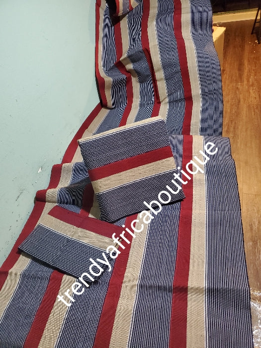 Aso-oke-Set aus nigerianischer Baumwolle. Klassische Farbkombinationen Wein/Marine/Beige/Weiß. Weiche, luxuriöse Qualität und einfach zu binden. Wird als Set verkauft und der Preis gilt für das Set