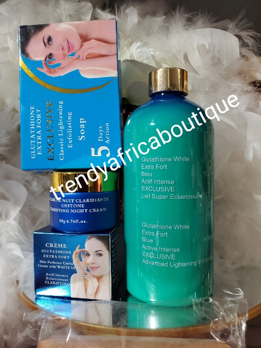 Perfect combo: Glutathion white Extra stronge blue, exclusive Active intemse exclusive intense whitening body milk, face cream & Exfoliating 5 days whitening bae soap