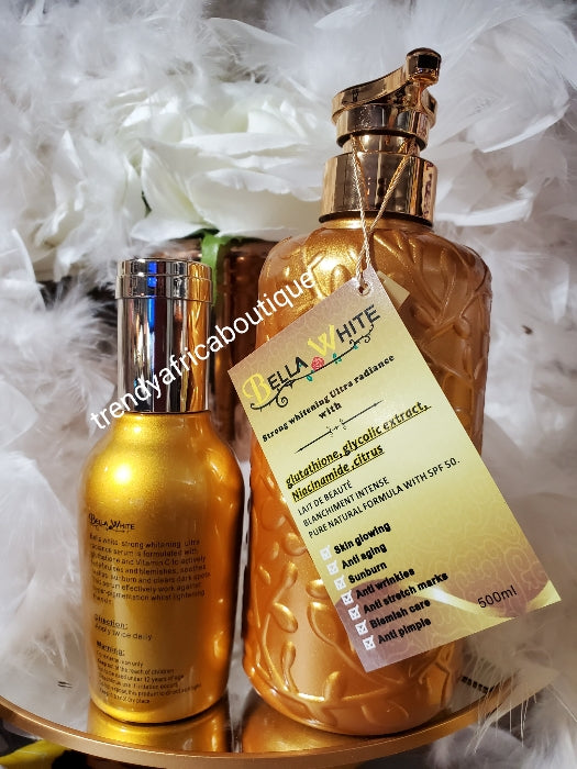 • 2pcs. Bella white Gold bottle is Strong whitening ultra radiance body Lotion & serum.  Formulated with glutathione, glycolic extracts & Niacinamide body lotion spf 50.  500ml